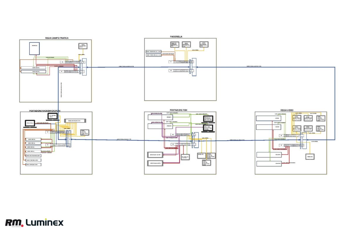 Tramite il protocollo DANTE, sono stati invece gestiti e distribuiti i segnali tra le varie postazioni di controllo e verso le televisioni presenti.