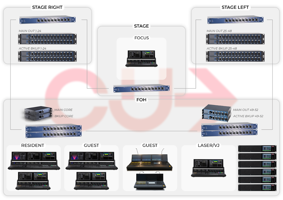Il team ha optato per un’infrastruttura di rete dove hanno fatto da protagoniste ben 6 grandMA3, 2 grandMA2 con 52 Out DMX generate in sACN con Luminode raddoppiati impostati come main e backup ridondati (chiudendo gli anelli), il tutto gestito da Lumicore e Gigacore e monitorato con Araneo della famiglia Luminex.
