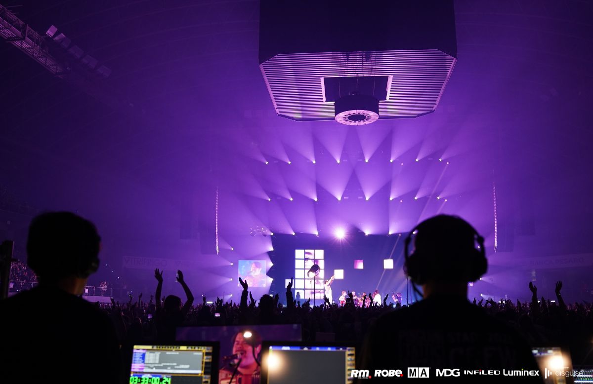 L’accoppiata di BMFL Blade (sempre della famiglia Robe) e il sistema Zactrack si è rivelata cruciale per creare effetti dinamici e seguirne i movimenti sul palco: “Abbiamo avuto modo di fare blackout, di fare dello strobo e spostamenti utilizzando i fari e posizionandoli con una truss sopra la regia in tutti i palazzetti. Così facendo potevamo seguire i ragazzi sul palco mentre si alzavano o abbassavano dai lift oppure quando camminavano in passerella.” ha commentato Lorenzo.